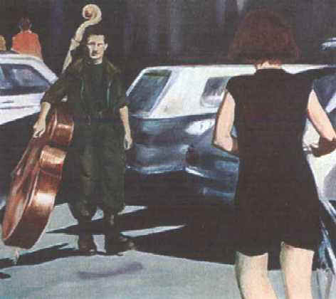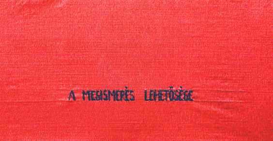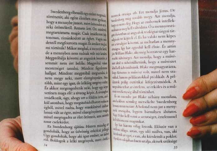 "Tibor Várnagy took a more intellectual and less direct approach to the issue in both of his Salvo Titulos [...]. The Borges writing held by a woman in his diptych suggests, on the one hand, that even the gentler sex may appreciate intellectual products, and on the other, that although it is held by a woman, the book is turned towards the viewer, not the woman herself; anyway, such an object in a hand rendered coarse by worn reddish nail enamel is almost sacrilege. However, this is by no means the usual opposition of body and intellect. The open Swedenborg essay is a parable of the hermit whose renouncing sensual pleasures is mere futility; he rejects everything, by which upon entering Heaven he does not understand the language of the angels and "his atonement makes him unworthy of Heaven, for he has impoverished himself, renounced the pleasures of life-which is also a bad deed." Real redemption-so Swedenborg says-is possible intellectually for those who are capable of theological discourse with the angels.