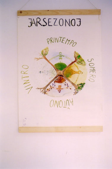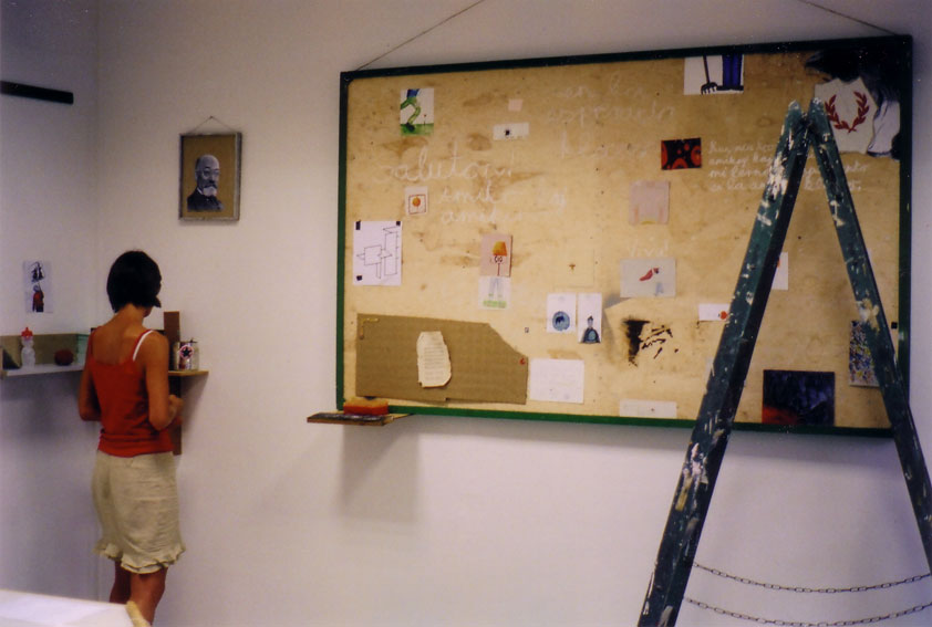 This environment is an esperanto language classroom made mostly from reused garbage materials from the streets of the town (Amsterdam) installated into a former shelter (temporaly space of W139 Galery) with drawings and esperanto poems by Loránt Aniko