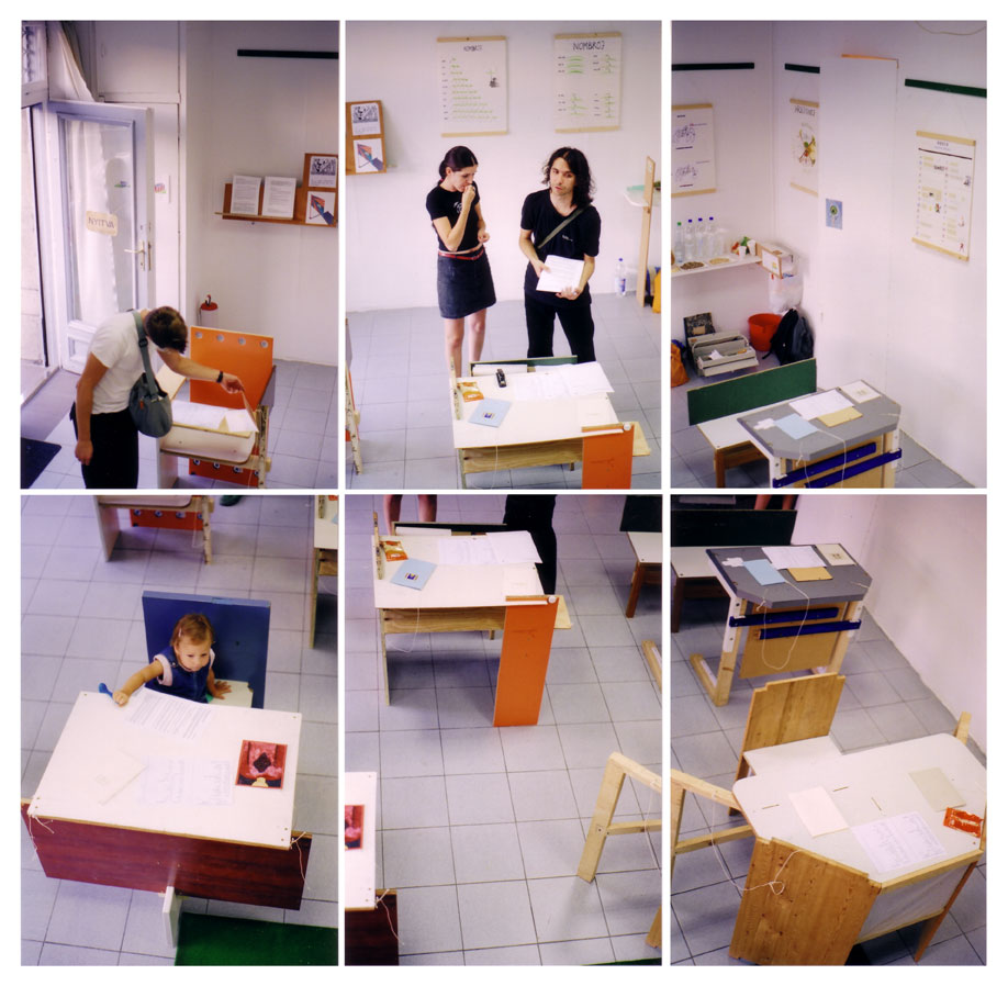 1st level: An ad hoc classroom made as if in a case of emergency with its typical set of furniture – set in a corner of the space with at least one brick wall, separated with draughtscreens. (African school, school in war area, etc.)2nd level: The benches and chairs of the classroom fabricated of trash material collected on the streets, however, in a classical modernist style (battered Bauhaus and de Stijl).
