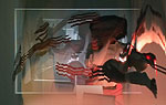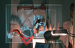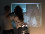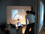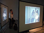 Jenő Lévay: Harmonográf interactive installation In the course of producing each harmonogram (exposure), the camera records the image made up of the points along the vertical lines that succeed one another. The processes occurring in front of the machine, the starting and finishing points in time of the operations to be performed, appear in a single figure. The method of exposure resembles that of the slit camera. It is always only a vertical line of the view that is registered at a time. Progressing from right to left along this narrow band, the image is drawn onto the three screens – within thirty seconds. (The time of this mode of exposure does not resemble that of the long exposure of traditional photography, but should rather be imagined as a sequence of extremely brief exposures, taking place over the course of thirty seconds.) The most unusual feature of the harmonograph is that it is capable of drawing the mirror image as it appears in time, if in the course of preparing the harmonogram, the movement of the motif is of variable velocity relative to the speed of the line of sensation (it lags behind the exposure time, or it overtakes it). The line of detection is indicated by a thin, red band on the screens. From among the three harmonograms appearing on the laptop monitor, one may be printed by double-clicking on the image. The process can be restarted by clicking on the start button of the laptop. Until the next exposure, the previous harmonograms are visible on the screens. |