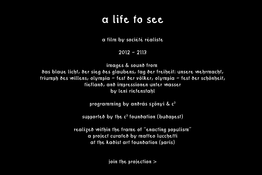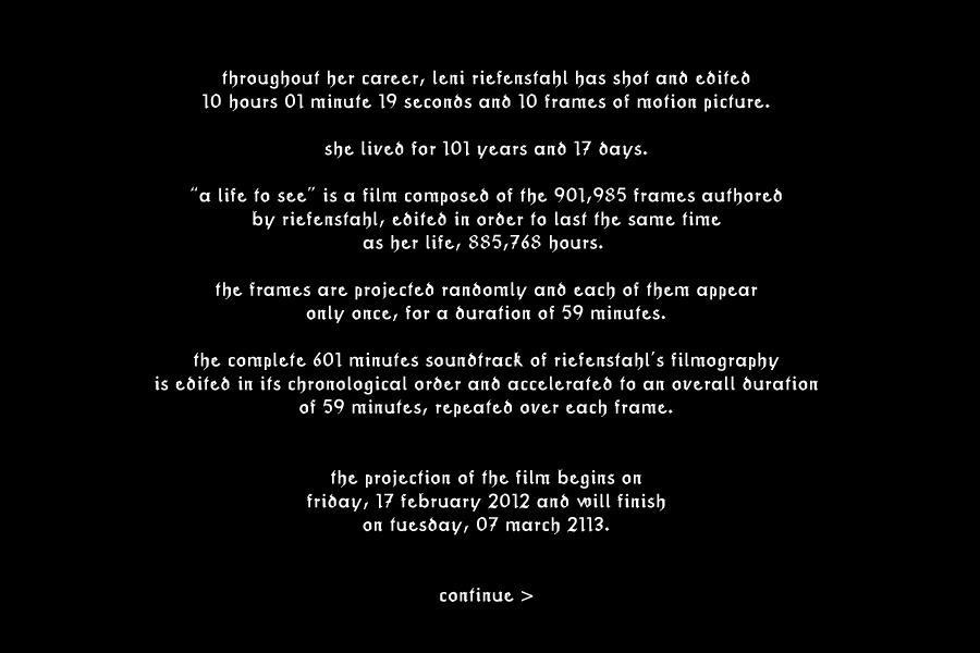 amíg Riefenstahl élt, azaz 885 768 óráig. Az egyes filmkockák véletlenszerűen vetítődnek,