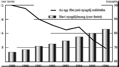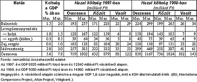 A fenti javulás 1994-hez viszonyítva 1998. évi áron számolva mindössze 153 milliárd Ft-ot tesz ki, ami az általunk alább kimutatott elvont összegeknek mindössze 3%-át képezi. Más szavakkal fogalmazva, a megszorító intézkedések által elvont pénzek 97%-a “eltűnt”. (A kórházi ágyak példája ezt világosan mutatja: az ágyak száma csökkent, a várt megtakarítás pedig gyakorlatilag nem következett be.) Ugyanakkor a társadalomban az óriási mértékű elvonások miatt a működőképesség általános romlása következett be.