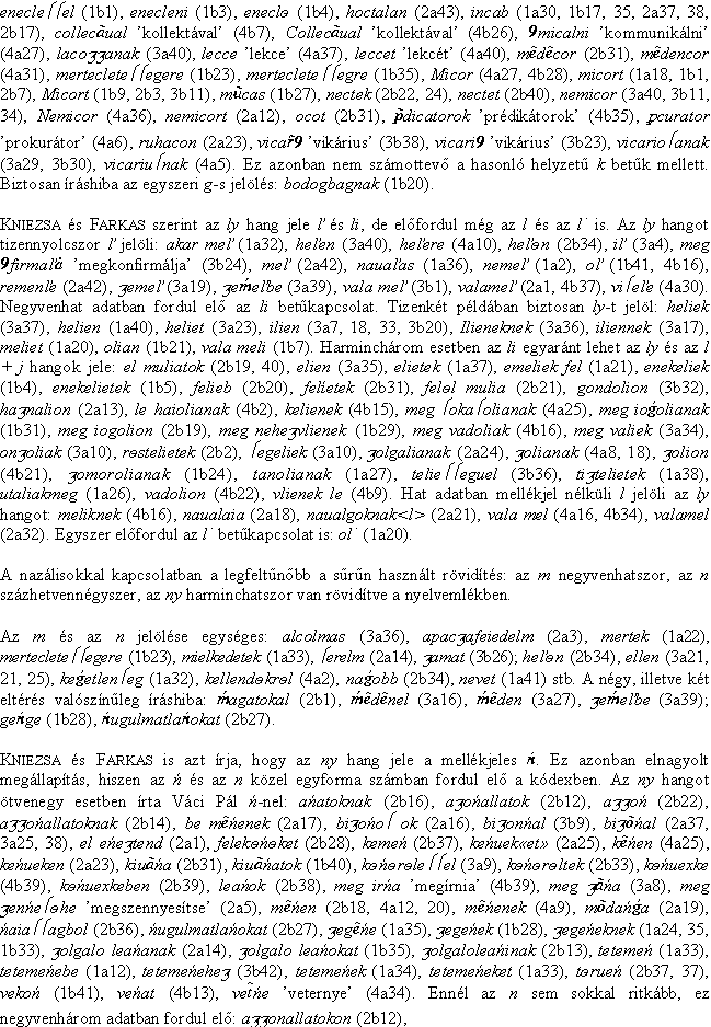 2. A magyar nyelvű kódexek helyesírásának átfogó vizsgálatával Kniezsa István és Farkas Vilmos foglalkozott (Kniezsa, Helyesírásunk története a könyvnyomtatás koráig. Bp., 1952. 102—4; Farkas, Helyesírásunk hangjelölés-rendszerének története. NytudÉrt. 74. sz.).