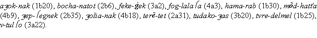 (1a6), kikben (3a37), mielkedetekben (1a32),