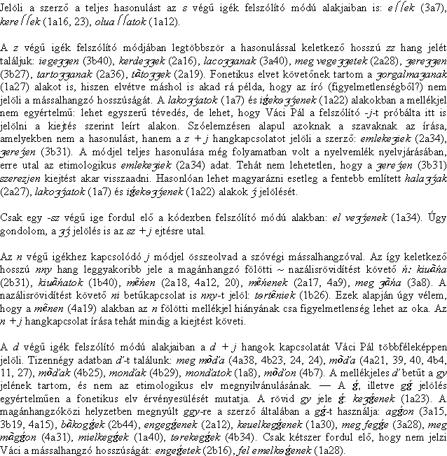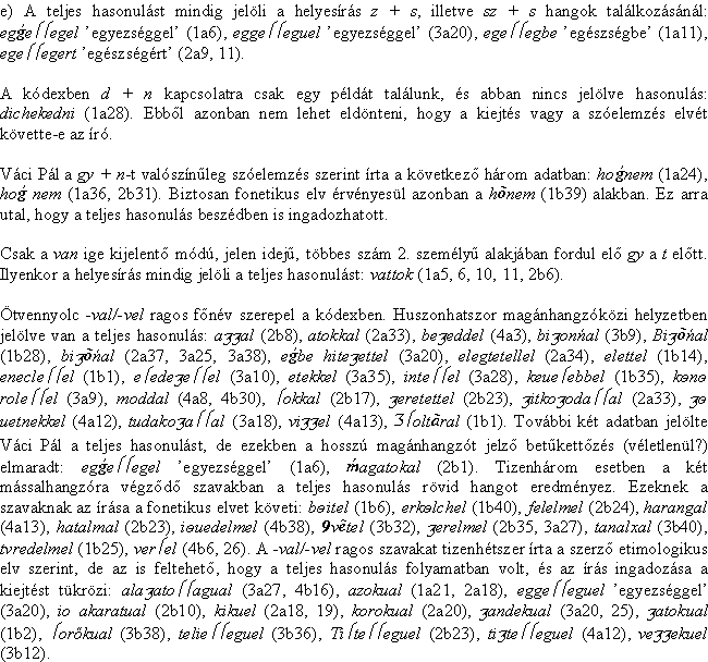 A beszédbeli teljes hasonulást a felsorolt kilencvenhat adatból hetvenötben (78,1%) tükrözi az írás. Egy példa írásmódja attól függ, hogy Váci Pál nyelvjárásában hasonult-e a d az őt követő n-hez. A gy + n hangkapcsolatnak és a mássalhangzó + -val/-vel ragnak az ejtése is ingadozhatott.