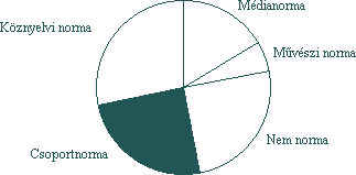 Magam ugyancsak fontosnak tartom a normátlanság (kevésbé normativizált)–norma tengelyen elhelyezni a különféle normatípusokat. S itt már a médianorma is helyet kap. Egy korábbi tanulmányomban (Balázs 1997: 275) be is mutattam nyelvinorma-tipológiámat. Nem normának (nem normalizált nyelvváltozatnak) tekintem az alkalmi és a csoporthoz nem vagy nehezen köthető nyelvváltozatot. A csoportnorma (a nyelv vízszintes és függőleges tagolódásának megfelelően) viszonylag jól kutatott és meghatározható terület. Erre rétegződik a köznyelvi norma és a médianorma. „Médianorma alatt a köznyelven alapuló, de a közvetlen kommunikációban használt köznyelvnél szándékosan gazdagabb, ’mívesebb’ nyelvváltozatot értem… Az ideális médianyelvhasználat központja a köznyelvi normán alapuló ’emelkedettebb’ médianorma, amely szüntelen érintkezésben van a köznyelvi normával, valamint a művészi normával. A média ideális ’belső’ normája így a médianorma, közvetlen ’külső’ normája a köznyelvi és a művészi norma, s nem befogadott külső normája a csoportnorma. A kimaradó rész a ’nem ideális’ médianorma, amely ha betört a közműsor-szolgáltató médiumokba, indulatot, felháborodást vált ki…” (Balázs 1997: 275). Ha mindezt kördiagramban ábrázoljuk, fönt foglalnak helyet az ideális médianyelvhasználat kategóriái: