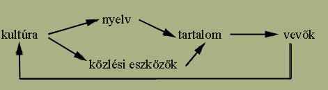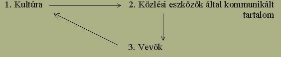 (A kultúra a szimbólumrendszer, amely a közlési eszközök meghatározása révén behatárolja a kommunikált tartalmat, ez viszont a közönségen keresztül visszahat a kultúrára. )