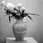 Leírás: Az összeszűkülő nyakú, vörös vázában E.M. 1970-ben virágcsokrot állított ki. A gesztus logikája: amint a reday-made használati tárgyat állított a műalkotás helyébe, E.M. a hagyományos festészet virágcsendéletét annnak modelljével helyettesíti.