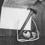 LEíRÁS: Altorjai a fekete szemüveges E.M. mögött áll és mondatról mondatra fülébe súgja a gyagyaista kiáltvány-t (E.M. írása). E. M. minden mondatot hangosan megismétel. Szemüvege mögött kamillateás vatta van. A felolvasás végeztével E.M. egy kalapáccsal betöri szemüvege mindkét üvegét. Két fia, Gyuri és Dani kamillateás vattát osztanak ki a közönség között. Jegyzetlapok egy soha el nem készülô gyagyaista kiáltványból - Gyagya bácsi még édes dajkáját, a Dadát sem érti meg - Értetlenségében a gyagyaizmus engedélyezi a táblaképfestészetet mert miért pont a táblaképfestészetet ne engedélyezné - a festészeti gyagyaizmus a festéket nem szívesen befolyásolja. - Gyagya bácsi szívesen lemond arról, amihez kedve van, és nem szívesen követi el azt, amihez nincs kedve - a tilosról ugyanúgy képtelen fogalmat alkotni, mint a kötelezôrôl - Gyagya bácsi, ha beteg, az engedékenység meggyógyítja - rendszerint saját engedékenysége - Gyagya bácsi bizonytalansága nem terjed odáig, hogy némely dologról ne állapítsa meg, hogy fölösleges - Gyagya bácsi számára legtöbb dolog tökéletesen fölösleges - Gyagya bácsi minden békülékenysége ellenére sincs magával kibékülve - Gyagya arra menne, amerre terelik, de nem tudja megállapítani merre terelik - Gyagya nem érti, hogy miért terelik - Gyagya bácsi befelé fordul, és kint találja magát - Gyagya bácsi kifelé fordul és bent találja magát - Gyagya bácsit templomajtókban elfogta a félelem, hogy nem eléggé gyagya - A csillagos égre emeli szemét és látja, hogy a gyagyaság végtelen - Gyagya bácsi mentôl kevésebbet ért, annál tisztábban lát. Jegyzetlapok egy soha el nem készülô gyagyaista kiáltványból. Közölve: Altorjai Sándor Altorjai önmagát Gyagya bácsi-val azonosítota, mely személy köré valóságos individuálmitológiát teremtett s a kiállításon is számos Gyagya bácsis festményt bemutatott. A súgásmotívum viszont jól beleillett E.M. ekkortájt bontakozó elméletébe: A fejlettebb súg. Erre találunk adalékokat Gond és baj c. szövegében és ehhez kapcsolódó filmjében, az Antiszempont-ban is. A kamillateába mártott vatta, mely itt a nézôk szemének fertôtlenítésére - a tisztánlátásra - szolgál, ellenpontozza a más műveiben felbukkanó libazsíros vatta negatív funkcióját.IRODALOM: E.M. Obuda, 1986. 8. (repr. is); Beke: E. M. in: Híd