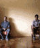A kiállítótérbe projektorral vetített mozgóképen két alak látható, akik a nézõvel szemben egyforma fotelekben ülnek egy semleges környezetben.
