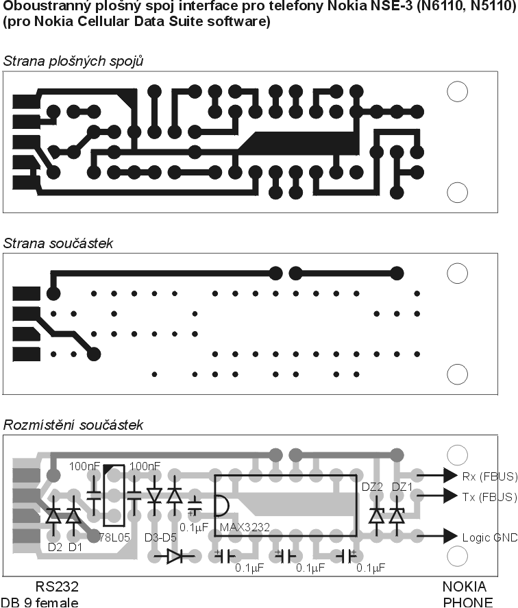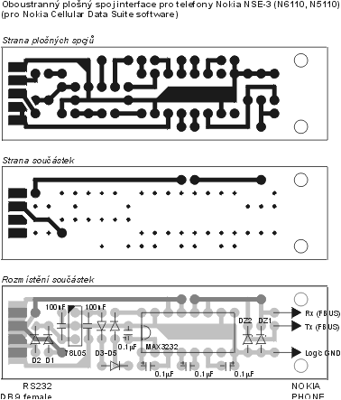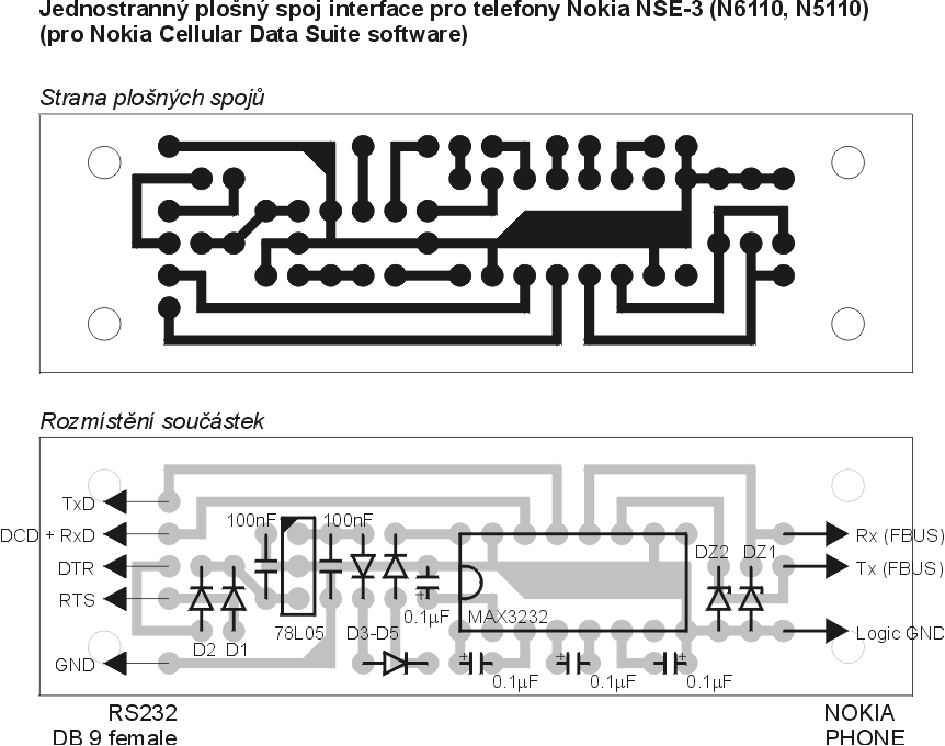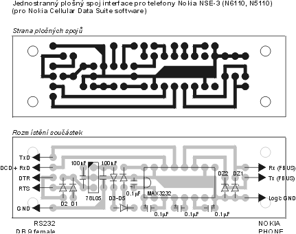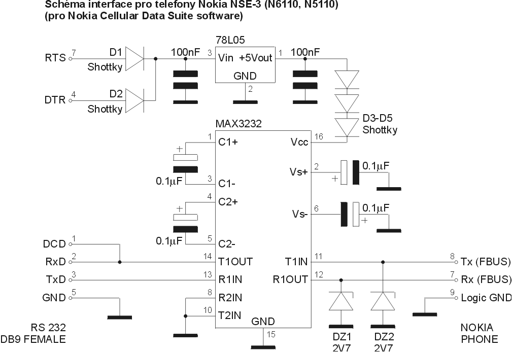 Nokia 6110 Cellular Data Suite Interface Zde je zapojení interface pro telefony N6110 a N5110. Pokud chcete schéma ve větším rozlišení, je zde. Celý interface je napájen signály RTS a DTR. Diody D1 až D5 doporučuji v Shottkyho provedení kvůli nižším proudovým nárokům. Rovněž 5V stabilizátor by měl být v "L" provedení, aby jeho odběr byl co nejmenší. Jelikož je obtížné sehnat 3.3V stabilizátor a zenerova dioda v tomto případě není vhodná (neboť log. 1 na COM portu může být tuším až 15V a úbytek na ní by byl veliký), stabilizece napájecího napětí (které by mělo být 3.3V) je zde řešena 5V stabilizátorem, za nímž je úbytek napětí na D3 až D5 cca 1.8V, t.j. výsledné napětí cca 3.2V. Pokud použijete normální diody a obyčejný stabilizátor, může se stát, že interface bude napájen o něco nižším napětím než 3.3V (v závislosti na COM portu počítače - log. 1 na RS232 je definovaná od +5V do tuším +15V, ale zvlášte u notebooků se pohybuje na spodní hranici 5V, na diodě je úbytek zhruba 0.6V, tzn. napětí před stabilizátorem může být i 4.4V a stabilizované v tomto případě kolem 4.1V, úbytek na D3 až D5 je cca 1.8, t.j. napájecí napětí může být i 2.3V), což by nemuselo ani tak moc vadit (po testech jsem zjistil, že MAX3232 funguje spolehlivě ješte na hranici 2V), ale proudová zátěž COM portu bude zbytečně větší. Zenerovy diody DZ1 a DZ2 jsou VELMI důležité pro bezpečnost vašeho telefonu. Normálně jsou napěťové ůrovně log. 1 na hranici 3.3V, ale i mírné překročení této hranice může vést ke zničení telefonu nehledě na proudové nárazy při zapnutí počítače nebo při zasouvání interface do počítače. Diody DZ1 a DZ2 toto napětí omezují na 2.7V což bohatě stačí na hodnotu log. 1 a zárověň je to hluboko pod maximální přípustnou hodnotou. Jinak se jedná o standartní zapojení MAX3232. Piny č.8 (R2IN) a č.9 (T2IN) není bezpodmínečně nutné zemnit.