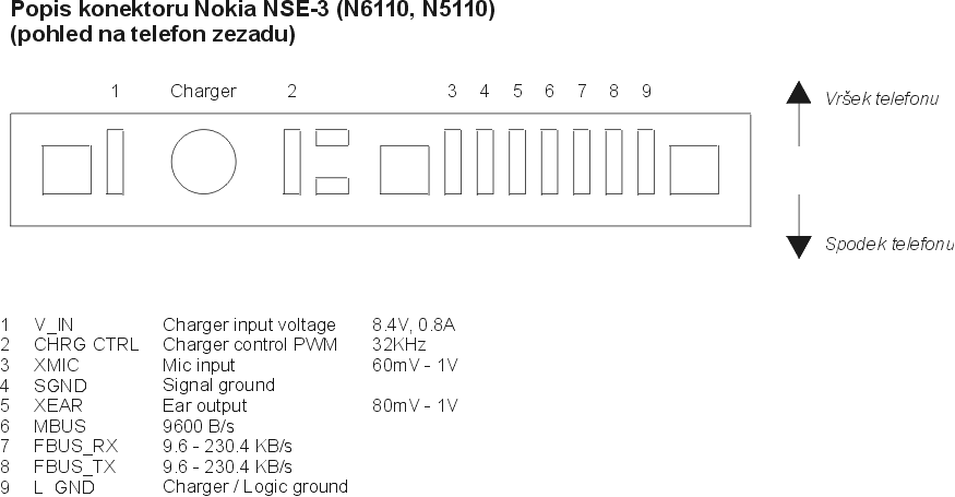 Zde je popis zapojení konektoru telefonu, totéž ve větším rozlišení a s popisem signálů zde. Popisy signálů nemá smysl překládat, takže jen anglický originál :-)