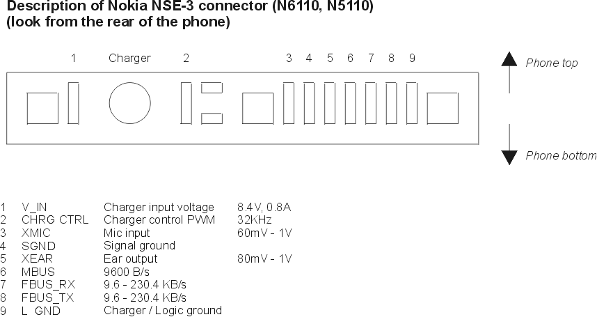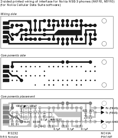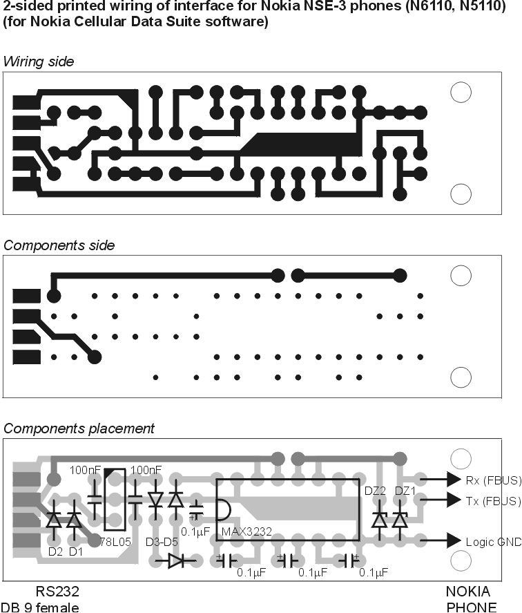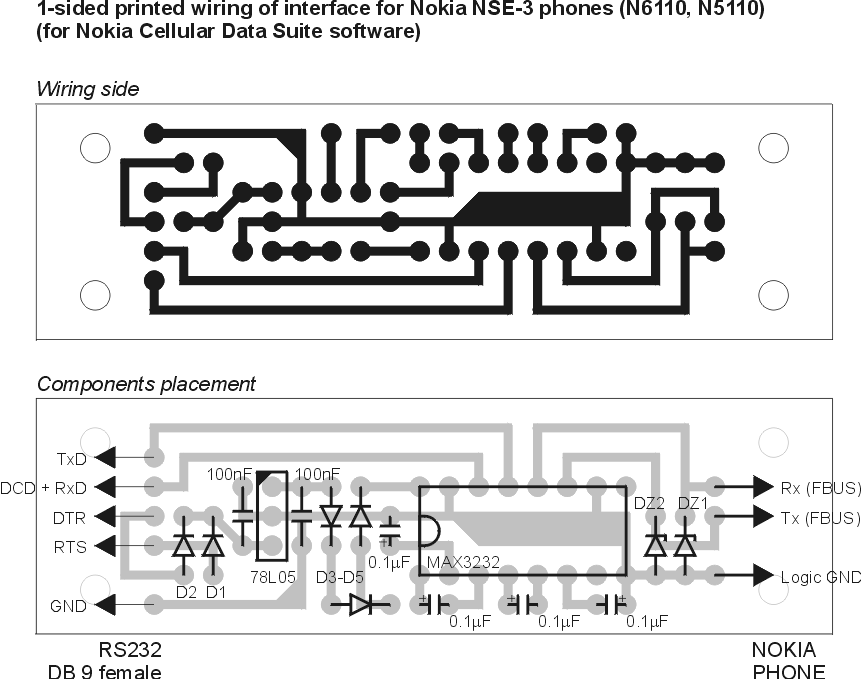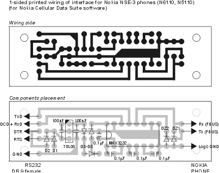 Nokia 6110 Cellular Data Suite Interface Here is the schematic for N6110 and N5110 phones. If You want it in better resolution, is here. All interface is powered by RTS and DTR signals. D1 and D2 diodes I recommend in Shottky design since lower dropout.So 5V regulator should be in "L" design (low drop version). Buying 3.3V regulator is not easy and zener diode is not proper in this case (COM voltage can be +15V and drop on zener diode will be big), the voltage regulation (which should be 3.3V) is here done by 5V regulator with diodes D3 - D5 on which is drop about 1.8V, so final voltage is 3.2V. You can use normal diodes and normal voltage regulator, but MAX3232 may be powered by voltage less than 3.3V (depends on COM port in computer - log. 1 on RS232 may be between cca +5V and +15V, but in notebooks it is on lower value, on diode is drop about 0.6V, so before regulator it may be 4.4V, after regulator about 4.1V, drop on D3 - D5 diodes is about 1.8V and in this case voltage can be 2.3V) - it can be wrong (I tested MAX3232 works fine on voltage 2.0V), but amperage of COM port will be unnecessarily bigger. Zener diodes DZ1 and DZ2 are VERY important to safety of Your phone. Normally are values of log. 1 about 3.3V and little overcross of this value can damage the phone - so power blast at turning on computer or connecting interface into computer. DZ1 and DZ2 diodes cuts-down this voltage to 2.7V - it is enough to log. 1 and it is hardly under maximal voltage value. In all, it is standard wiring of MAX232. Pins No.8 (R2IN) and No.9 (T2IN) You needn't to connect to ground.