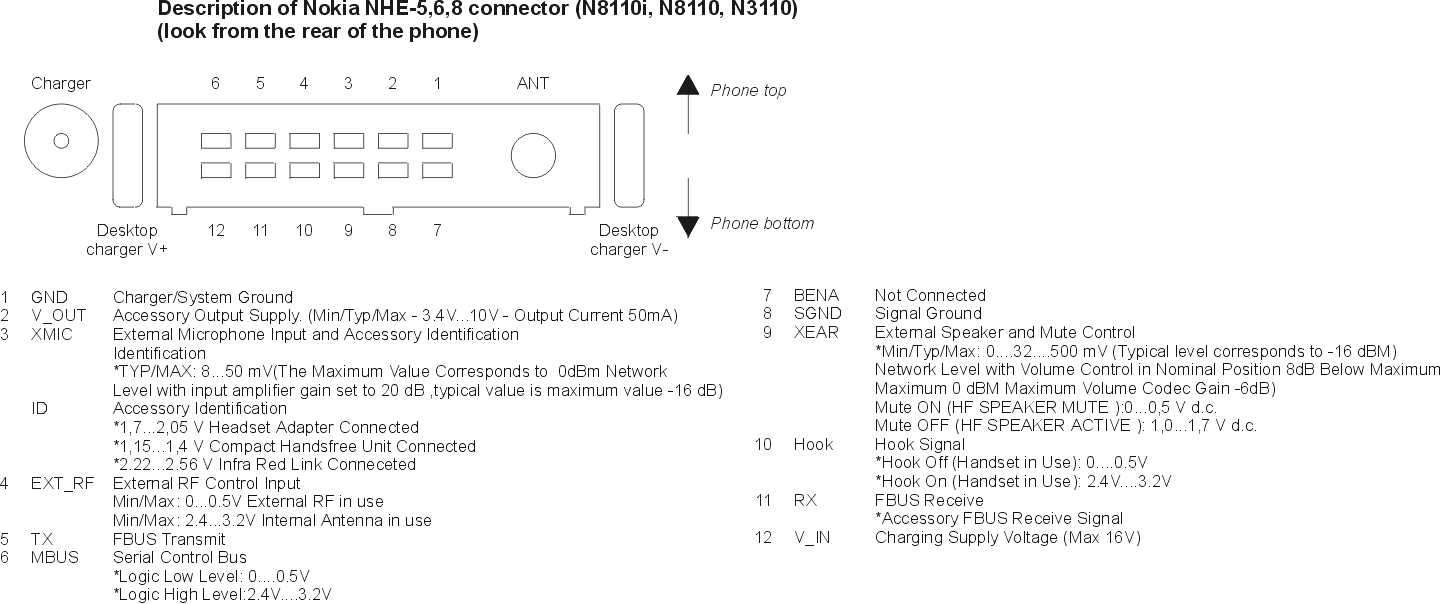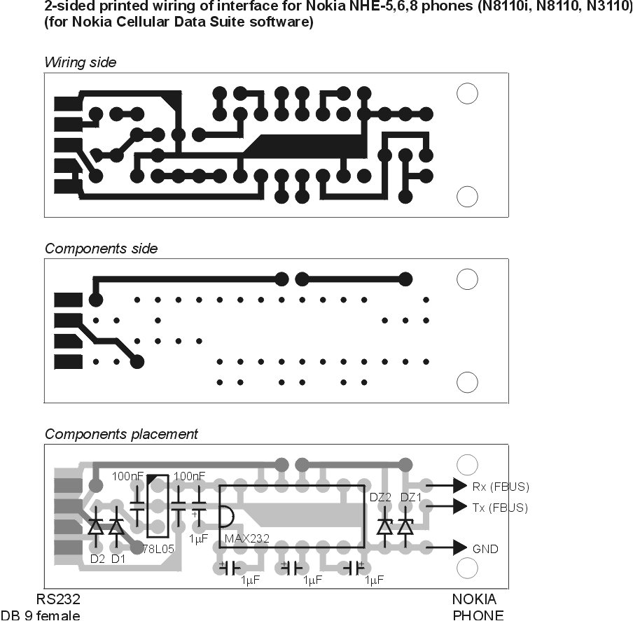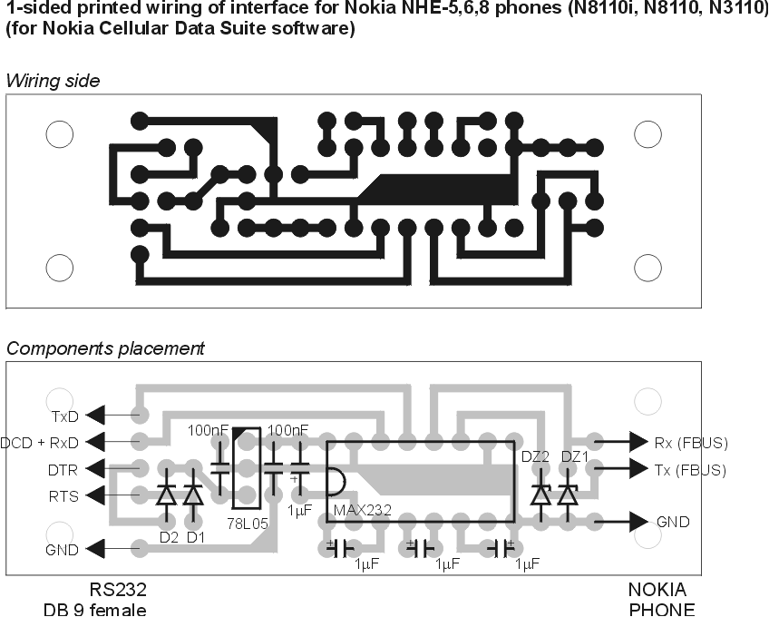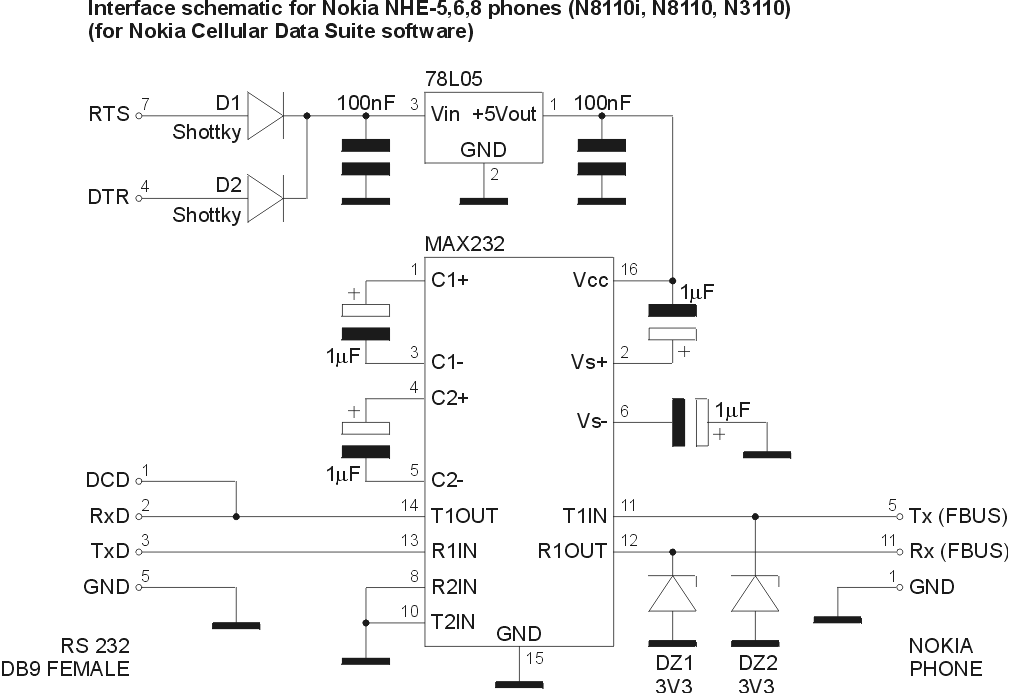 Nokia 8110 Cellular Data Suite Interface Here is the schematic for N8110i, N8110 and N3110 phones. If You want it in better resolution, is here. All interface is powered by RTS and DTR signals. D1 and D2 diodes I recommend in Shottky design since lower dropout.So 5V regulator should be in "L" design (low drop version). You can use normal diodes and normal voltage regulator, but MAX232 may be powered by voltage less than 5V (depends on COM port in computer - log. 1 on RS232 may be between cca +5V and +15V, but in notebooks it is on lower value, on diode is drop about 0.6V, so before regulator it may be 4.4V and in this case after regulator about 4.1V) - it can be wrong (I tested MAX232 works fine on voltage 3.5V), but amperage of COM port will be unnecessarily bigger. Zener diodes DZ1 and DZ2 are VERY important to safety of Your phone. Normally are values of log. 1 about 5V (or 3.3V ??) and little overcross of this value can damage the phone - so power blast at turning on computer or connecting interface into computer. Voltage 5.1V will damage phone port - tested :-((( !!! DZ1 and DZ2 diodes cuts-down this voltage to 3.3V - it is enough to log. 1 and it is hardly under maximal voltage value (or exactly fine, if log. 1 is 3.3V ???). In all, it is standard wiring of MAX232. Pins No.8 (R2IN) and No.9 (T2IN) You needn't to connect to ground.