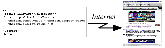 Netscape Navigator 2.0 (and later versions) can interpret JavaScript statements embedded in an HTML page. When Navigator requests such a page, the server sends the full content of the document, including HTML and JavaScript statements, over the network to the client. The Navigator then displays the HTML and executes the JavaScript, producing the results that the user sees. This process is illustrated in the following figure.