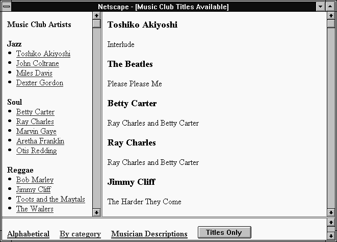 If you designed the frameset in the previous section to present the available titles for a music club, the frames and their HTML files could have the following content: