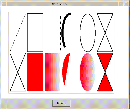 ShapesPrintactionPerformedmethod.public void actionPerformed(ActionEvent e) { if (e.getSource() instanceof JButton) { PrinterJob printJob = PrinterJob.getPrinterJob(); printJob.setPrintable(this); if (printJob.printDialog()) { try { printJob.print(); } catch (Exception ex) { ex.printStackTrace(); } } } }You can find the complete code for this program in
