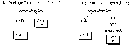 Note: For security reasons, browsers limit the URLs from which untrusted applets can read. For example, most browsers don't allow untrusted applets to use ".." to get to directories above the code base or document base. Also, since untrusted applets can't read files except those on the applet's originating host, the document base isn't generally useful if the document and the untrusted applet are on different servers.Appletclass defines convenient forms of image-loading and sound-loading methods that let you specify images and sounds relative to a base URL. For example, assume an applet is set up with one of the directory structures shown in the following figure.To create an