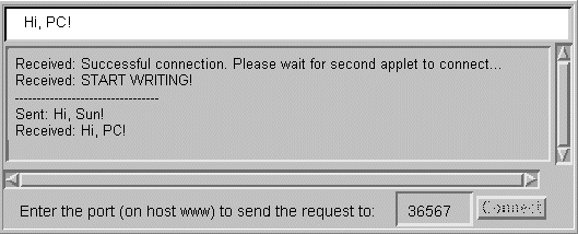 example/TalkServer.javaandexample/TalkServerThread.javaAfter compiling both files, you can run the server on the applets' originating host by invoking the interpreter on theTalkServerclass.The instructions for running the server are just like those for the previous example. Run the server on the applets' originating host, recording the port number the applets should rendezvous on. then initialize both applets (which can be running on different machines) to talk to the server port number. After this initialization is complete, type into each applet and press the Return key to send the message to the other applet.