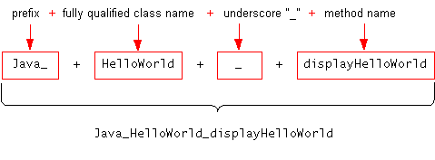 Java_HelloWorld_displayHelloWorld. No package name appears in our example because HelloWorld is in the