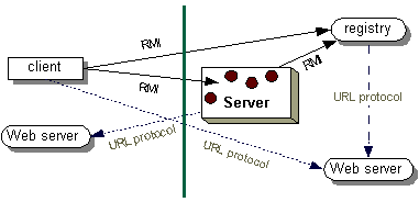 The following illustration depicts an RMI distributed application that uses the registry to obtain a reference to a remote object. The server calls the registry to associate (or bind) a name with a remote object. The client looks up the remote object by its name in the server's registry and then invokes a method on it. The illustration also shows that the RMI system uses an existing Web server to load class bytecodes, from server to client and from client to server, for objects when needed.
