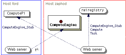 ComputePiclient loads theComputeEngine_Stub, also from theCompute-Engine's web server, as a result of theNaming.lookupcall. Since theComputePiclient has both theComputeand theTaskinterfaces available in its class path, those classes are loaded from the class path, not the remote location.Finally, the