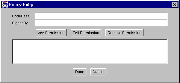 Note: Each backslash in the file path you typed has been replaced with two backslashes, for your convenience. Strings in a policy file are processed by a tokenizer that allows \ to be used as an escape character (for example,\nto indicate a new line), so the policy file requires two backslashes to indicate a single backslash. If you use single backslashes as your directory separators, Policy Tool automatically converts them to double backslashes for you.You are now done specifying this policy entry, so choose the Done button in the Policy Entry dialog. The Policy Tool window now contains a line representing the policy entry, showing the SignedBy value, as shown in the following figure.