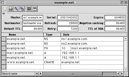 Line 5 is a CNAME record telling the world to treat www.example.net. as if it were example.net.