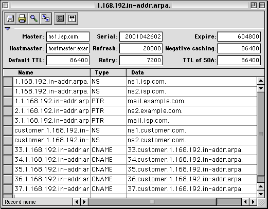 This example provides reverse NS records, ISPs name servers, and PTR records for resolving ISPs name and mail servers. There could easily be thousands of records dealing with reverse delegations for customers other then customer.com. For the sake of the example, Customer will be ISPs first and only customer.