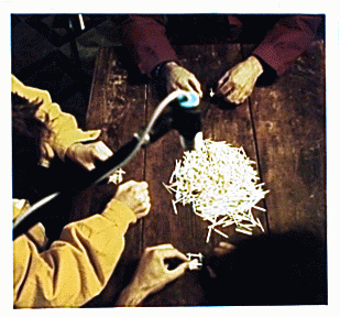 The three performers are sitting at a table. In front of each of them a pile of matches is placed and three ultrasound sensors measure the distance between the table surface and the sensor. The three sensors are adjusted above a table. Each performer begins to construct a tower out of matches within the measuring area of the sensors. She/he stops her/his activity when the tower collapses. The sensors measure the growth of the three match-towers. The result of the measurement is transformed by a computer into different sound parameters.