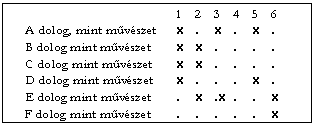 Az egyes, híveik szerint mûvészetnek tekintett dolgok dolog-tulajdonság mátrix formájában ábrázolhatók. Ehhez tételezzünk föl öt dolgot, melyrõl különféle eltérésekkel azt állítják, hogy MÛVÉSZET, és tegyük föl, hogy ennek az öt MÛVÉSZETNEK állított dolognak különféle ismertetõjegyei vannak olymódon, hogy azok kielégítik Erdély tézisét, miszerint nincs olyan tulajdonság, mely mind az öt, mûvészetnek tekintett dologban közös volna: