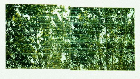 El-Hassan Róza Önmagával összekötött fa Vegyes technika (fehér tinta színes fotón), 200 x 400 cm, 1995-96 A két pillanatfelvétel ugyanarról a dologról készült, közben egy szempillantásnyi idõ telt el, kb. annyi, mint két filmkocka között, mégis minden megváltozott, a szél összekuszálta a gallyakat, egyetlen levél sem található ott, ahol volt.