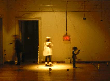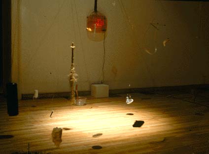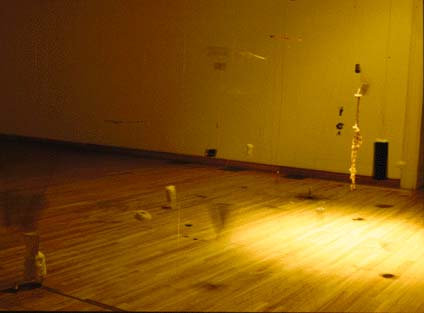 A plafonról - szabályos négyzetrácsot alkotva - vékony huzalok lógnak. Ezek végén, a padlóhoz közel, különbözõ "jeladó" vagy "jelhagyó" egységek (rádió, ecset-festék, iránytû-mágnes) függenek. Amikor belépünk a terembe, át kell vágnunk ezen a sötét, csak részben megvilágított huzal-erdõn. Miközben mozgunk, óhatatlanul megmozdítjuk ezeket az ingákat, s ezzel mûködésbe hozzuk a felfüggesztett egységeket (a rádió megszólal, az ecset fest, stb.). Mozgásunk egy, a termen kívül látható, térképszerû led-táblán követhetõ: a rács alakban elhelyezett ledek felvillanása jelzi a teremben mozgó ember útvonalát.