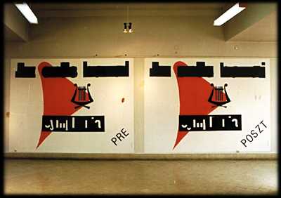 Pre / Postmanipulated billboard advertising posters, 2 pieces each 300 x 400 cm The new forms of design at the beginning of the Nineties express the new economic and political era in Hungary. The best example of this can be seen in the re-design of locally-produced cigarettes. The well known logo of "Sympfonia"cigarettes , however, was simply enlarged. In the artwork, the orginal advertisement text has been covered in order to extinguish the actual meaning. What is of interest is the process by which the past becomes the future without altering the visual form of the sign.