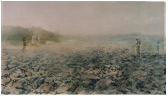 Vagy mégis az egyik figura mellett álló halványabb, de ugyanolyan társ (klónozás?, égi más?), utalna valamiféle áthallásra az alakok, közvetve a két táj között? Talán a talaj síkján végigvonuló sávozottság utalna egy olyan sztereogram rejtett jelenlétére, mely megadná a kulcsot a kép(ek) értelmezéséhez?