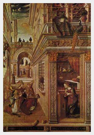 A geometrikus perspektíva következetes alkalmazása jellemzi Crivelli Angyali üdvözlet címû képét. Hogy az építészeti elemek puszta síkdekorációvá válását elkerülje, a mûvész hangsúlyozottan lágy, organikus formákat helyez el a kritikus jobb felsô negyedben. Biztosra vehetjük, hogy az elôtérben látszólag gondatlanul utcára vetett gyümölcsök is jórészt ezt a célt szolgálják.