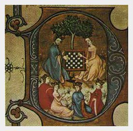 This demonstrates stereoscopic character with figures in space. The subordination of perspective relation to meaning can be clearly seen in the picture: the royals occupying the central space are perceived as larger than the figures at the front. The chessboard is turned toward us (for easier comprehension) by the artist. Actually all the pictorial images are converted to the basic plane of the inner space of the letter. The stereoscopic image is originated partly by the disclosure of shapes and forms, partly by the basic plane’s moving into the foreground as its tonality changes and partly by the "keyhole effect" in the visual field. (Miniature from the 15th century)