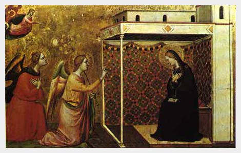 The early use of geometrical perspective show that the artists were not perfectly aware of its regularities. The vanishing points do not always meet, and we can see that the artists in some cases, e.g. depiction of the floor, use the safer means of symmetry. We can see that the harsh planes of the drapery appear to be closer than the gently depicted angels, hereby creating the relation between Maria and the angels in the picture plane. (Bernardo Daddi: The Annunciation, c.1340)