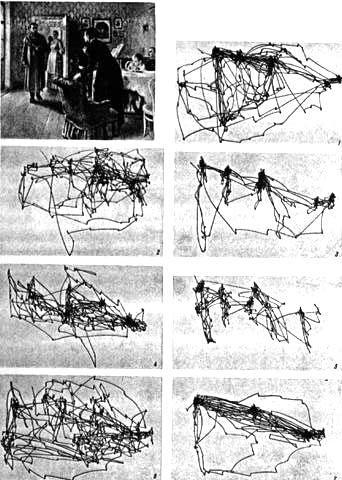 This example is from the book of A.L.Yarbus (Eye Movements and Vision, Plenum, New York, 1967). While the subject looked at Rjepin’s picture "Unexpected Visitor", his eye movement was being registered. The subject had to answer different questions while his/her eyes were surveying the picture. The subject studied different details closely, and hardly any similarities could be discovered between the registers.