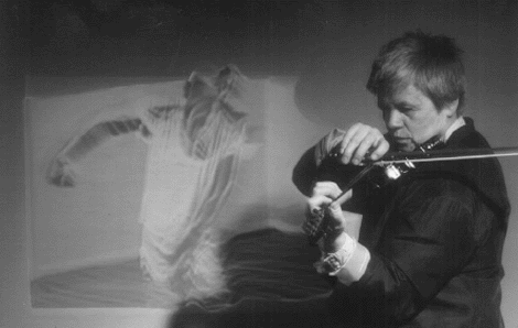Az elsõ csoport az INFOSTATION-nek nevezett lézerállomásokon található: ezekbõl körülbelül öt került elhelyezésre a kiállításon. Hozzávetõleg kétszáz állóképet és közel húsz mozgóképszeletet tartalmaz. Mindegyik a katalógusban bemutatott Eszközök történetéhez és használatához kapcsolódik. A hozzájuk tartozó sávkódokat Az eszközök és a Videó: a mûvészet állapota címszavak alatt találhatja meg a katalógusban. A sávkód alatti kis címkét kell keresni, az azon olvasható szöveg tartalmazza a tájékozódáshoz szükséges INFÓ-t. A lézerlemez-állomások második csoportja a ZENE feliratot viseli: ezek a múzeum csendesebb pontjain vannak elhelyezve. Legalább két ilyen állomás lesz felállítva: ezek álló- és mozgóképeket rejtenek hangmintákkal együtt, amelyeket David Dunn gyûjtött össze a katalógusban megjelent cikke illusztrációiként. Minden sávkód, ami Az elektronikus zene úttörõinek története címû cikkben található, a ZENE feliratú lézerlemezhez tartozik. A lézerlemez-állomások harmadik csoportja a NANO-(SZÍNHÁZ) A, B, C címkét viseli. Az Infostation-ben már megismert állóképek itt is megtalálhatók, ami azt jelenti, hogy ezek a képek a ZENE kivételével bármelyik állomáson hozzáférhetõek. Igaz, a mozgóképek minden lemezen különbözoek. Bár a lemezeket a katalógus használata nélkül is beprogramozhatjuk az állomásokon elérhetõ sávkód-összegzés segítségével, a lemezeken található anyagokról szóló információ legnagyobb részét a katalógusban találjuk. Például, ha a Könnyûzene a Szovjetunióban címû cikket vesszük, a katalógus NANO feliratú sávkódot mutat, ami egyben azt jelenti, hogy rengeteg állókép is tartozik a témához. Ha mindez untatná: a lézerlemez-állomásokon található, általános utasításkészlettel ellátott funkciógombok segítségével is nyugodtan böngészgethet. Apropó, a kiállításon van egy ENDO-SZÍNHÁZ nevû tér, ami arra van beprogramozva, hogy Steina által kiválasztott szalagokat játsszon le. Billentyûk és sávkódok nélkül. (Woody Vasulka) Steina VasulkaViolin Power [Hegedûerõ] Interaktív videóinstalláció és performansz