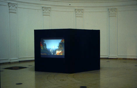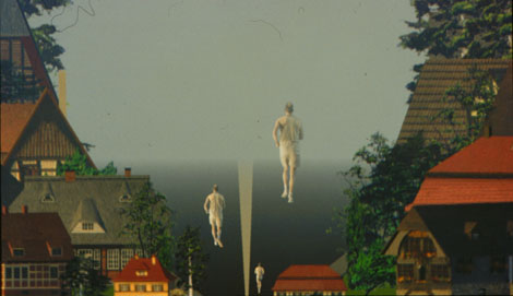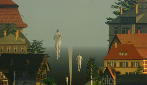 This is the second line of movement, the movement of the cylinders. The virtual camera is also mobile: it can move forwards or backwards along a circular path within the forest, thereby forming the third line of movement. The combination of the three lines makes it possible to produce movements running in every direction, including diagonals, spirals and so forth. With this structure, Waliczky alters the whole system of coordinates on which the representation of space depends. Whereas the tree directions (x, y and z) normally correspond to straight vectors, Waliczky's system of coordinates employs curved lines that loop back on themselves. This evokes a sense of limitless space: the viewer feels that there is no way out of the forest, which extends in every direction. The bare trees revolve endlessly around their own axis like patterns in a kaleidoscope. The resulting illusion is complete and deeply alarming: the infinity of the gaze leads to a total loss of perspective. The Way The Way is a three-dimensional computer animation mixed with live video. Three runners can be seen, followed by the camera, on a foggy street of a small German village. The typical German houses and the trees of this village are computer-generated in a traditional way: modeled and texture-mapped with Softimage. The three runners are the clones of one person; he was recorded on a treadmill in a video studio environment. Copying the actor onto the computer-generated background necessitated the use of a special mate software, written by Chris Dodge. The actor of The Way at the same time, is the musician-composer of the animation, Manfred Hauffen. To develop the animation has taken six months from design to the end. The Way was supported by Zentrum für Kunst und Medientechnologie (ZKM) Karlsruhe.