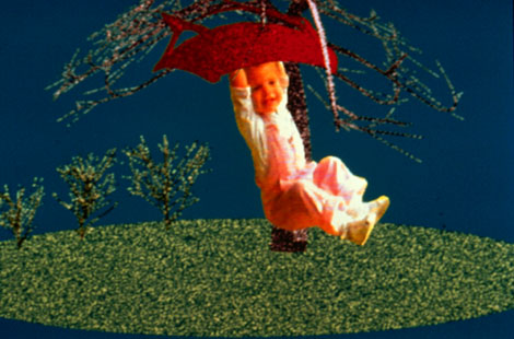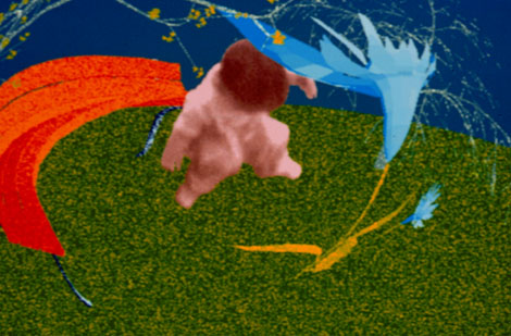The main idea of the animation is a new kind of perspective system, called Water-Drop Perspective System. This system was invented by myself, and programmed by Imre Kováts. The system comprises a spherical system with the small child in its centre. While in the Renaissance perspective, the viewer has a viewpoint at the eyes and vanishing points on the horizon, which is always a straight line, in my perspective system, there are endless viewpoints in the head of the child, and endless viewpoints all around her. The horizon in this system is not a straight line, but an oval. This means that the world ends between the child and the viewer. Thus the viewer is totally outside of the child's world; he or she has no importance. The small spherical world is the child's own world, and inside of this world, every object becomes bigger or smaller, has distortion, is visible or invisible depending on the distance between the object and the small girl, depending on her interest. I have invented this Water Drop Perspective System to make visible the close attention of children to their surroundings, to show the delight of their discovery.