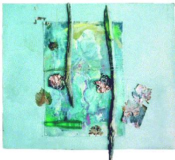 Altorjai Sándor Szõlõsgazda, igazi jó bor 1970; átalakítva 1979 Szõlõkarók, levelek, palack, a képre applikált kisebb olajfestmény farost 130*157 cm fotó: Makky györgy