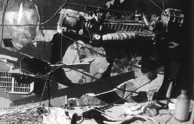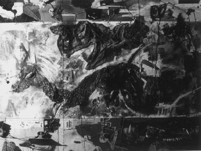 Altorjai Sándor Sugármeghajtású koporsó, kék leopárddal, színes rongy képében (Karácsonyra családomnak Munkácsy Mihály ihletése alapján) 1979 festett kollázs-asszamblázs farostlemezen 210*275 cm fotó: Gyökér László