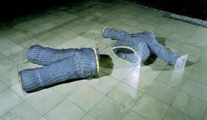 Chilf Mária • Laborminta, 1998, installáció: mûanyagcsõ, üveg, tészta, kitömött fehér egér, 350×180×70 cm • fotó: Rosta József
