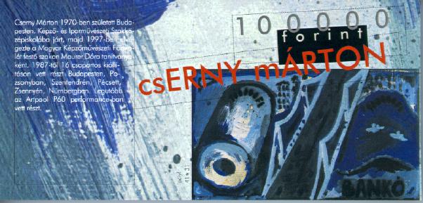 | Cserny Márton 1970-ben született Budapesten. Képzõ- és Iparmûvészeti Szakközépiskolába járt, majd 1997-ben elvégezte a Magyar Képzõmûvészeti Fõiskolát festõ szakon Maurer Dóra tanítványaként. 1987-tõl 16 csoportos kiállításon vett részt Budapesten, Pozsonyban, Szentendrén, Pécsett, Zsennyén, Nürnbergben. Legutóbb az Artpool P60 performance-ban vett részt. |