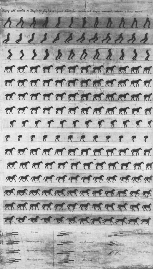 és Muybridge fényképein alapuló ábrázolása az ember és a ló mozgásnemeinek,