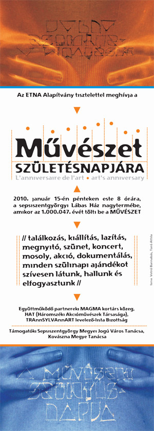 Meglepően sokan jöttek el január 15-én a sepsiszentgyörgyi Lábas-házba szervezett Művészetek Születésnapjára, mint 2010 – a Képzőművészet Éve Háromszéken eseménysorozat legelső rendezvényére. Az Etna Alapítvány 1996-tól következetesen szervezett megnyilvánulása ezúttal igen magas színvonalúvá sikeredett. Részt vettek a kiállításon Erdély fontosabb művészeti központjainak képviselői. De idegenbe szakadt hazánkfiai is. Tekintettel a nagy érdeklődésre a kiállítás időtartamát egy héttel meghosszabbították, tehát még január 29-ig megtekinthető.