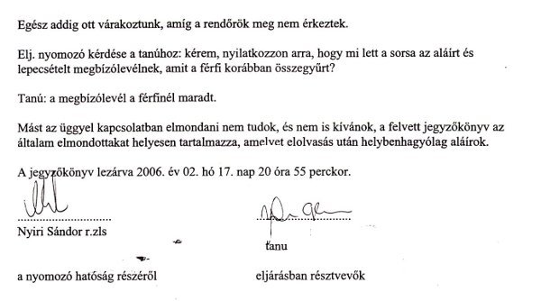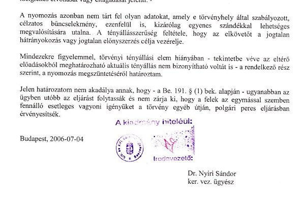 2006. július 4.-én megszületett az ügyészségi határozat, amelynek utolsó három bekezdését idézem. Arra persze gondolni sem merek, hogy azért talált ártatlannak az ügyészség, mert időközben lezajlottak az országgyűlési választások, és nem a FIDESZ győzött.
