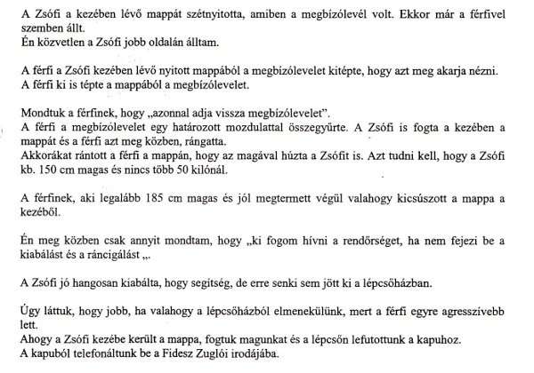 7. Valóban megbízólevél volt, a Fidesz és a KDNP illetékeseinek aláírásával. De a leányzó sipítozni kezdett, hogy azt nincs joga kiadni a kezéből. A megbízólevelet még mindig a kezemben tartva kértem, igazolja magát, hogy ő valóban az, akinek a nevére a megbízólevél ki van állítva. Kétségtelen, hogy ezt már dühömben, kötekedésből tettem. Társa futva menekült a cselédlépcsőn, a földszint felé.